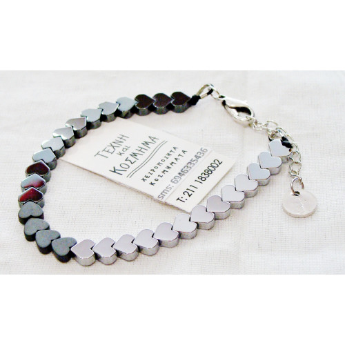 Βραχιόλι απο αιματίτη, σχήμα καρδιάς , δεμένο με σατεν νήμα υψηλής ποιότητος και αντοχής σε ένα παιχνίδισμα ματ - γυαλιστερού.