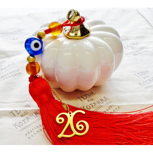 Κεραμική κολοκύθα - γούρι 26, βαμμένη με μοναδικά ανεξίτηλα χρώματα , διακοσμημένη με ατσάλινα και γυάλινα στοιχεία. Η φούντα είναι από μεταξωτό νήμα και συνδέεται με την αίσθηση ολοκλήρωσης και αφθονίας. ΑΡΙΣΤΗ ΕΠΙΛΟΓΗ