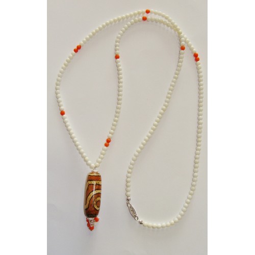Κολιέ (60 εκ.) με κοράλλι σε συνδυασμό λευκού και πορτοκαλί και στοιχελιο απο κόκκαλο νεροβούβαλου σχέδιασμένο στο χέρι.