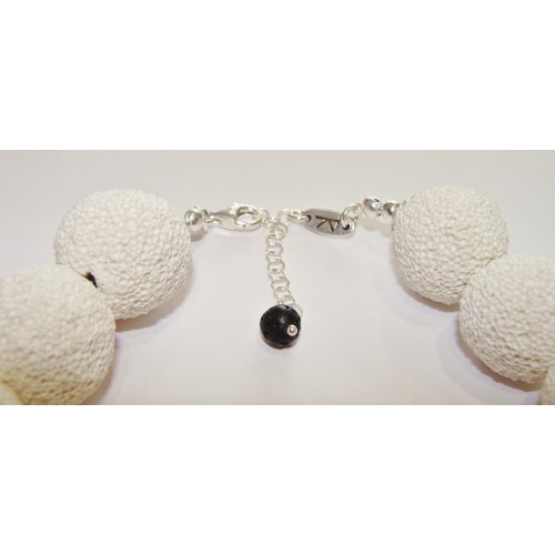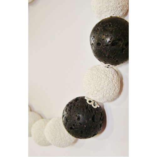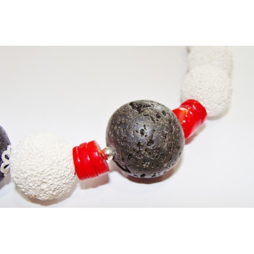 Περιδέραιο από ορυκτή λάβα σε συνδυασμό δύο χρώματων (άσπρου - μαύρου) και λεπτομέρεια κόκκινου κοραλλιού, δεμένο με ασήμι 925ο.