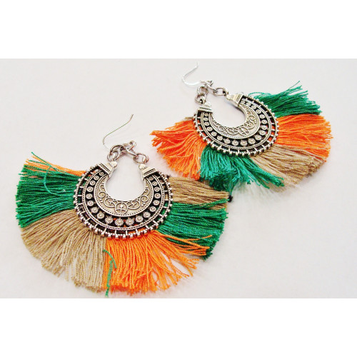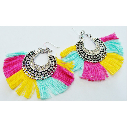 Art earring decorated with satin yarn in metal jewelery, silver plated with 1000th silver, in lovely color combinations and silver hook 925o.