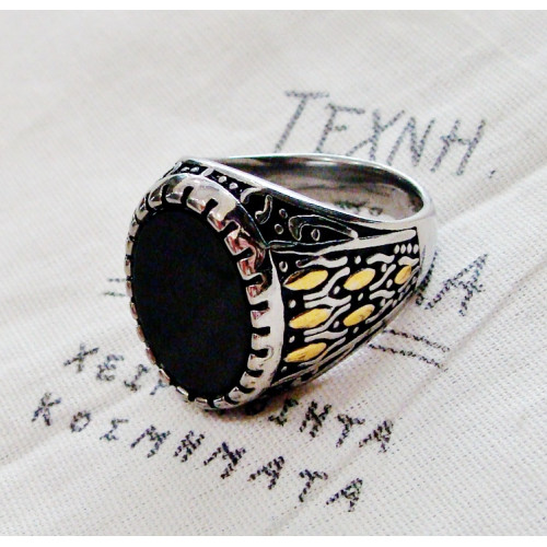 Steel ring, crafted with black onyx and 24 carat platinum plated.