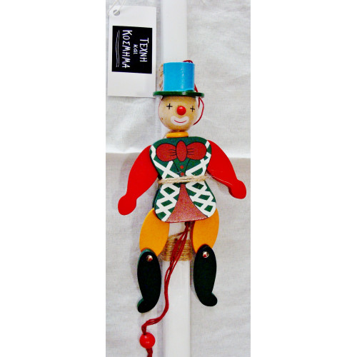 Easter candle 32 cm with a wooden figure of a clown - puppet and painted with indelible colors and decorated with linen thread.