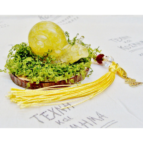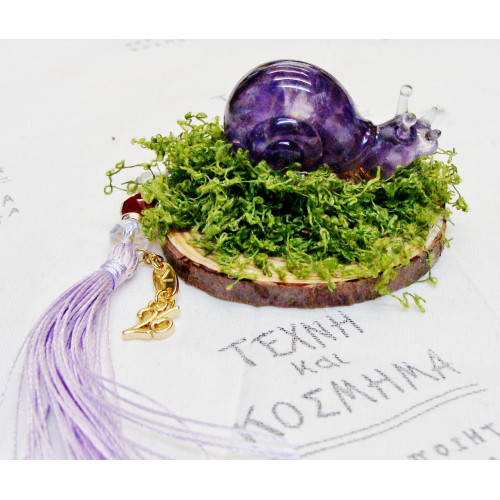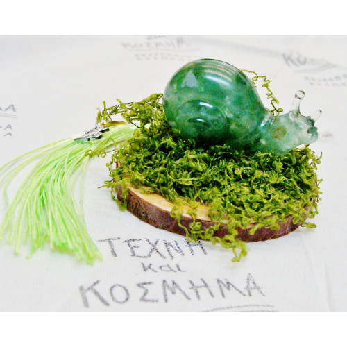 Vinyl snail, placed on a natural trunk tray and decorated with moss, glass beads, steel elements and a silk tassel.