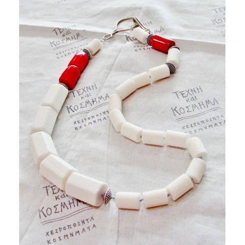 Περιδέραιο από φυσικό κοράλλι σε λευκό και κόκκινο χρώμα φιλοτεχνημένο με ατσάλινα στοιχεία και ιδιαίτερο κούμπωμα, δεμένο με σατέν νήμα πολύ υψηλής αντοχής και ποιότητος