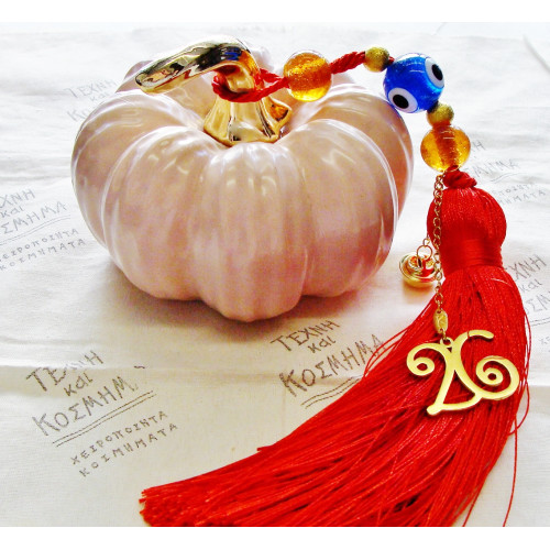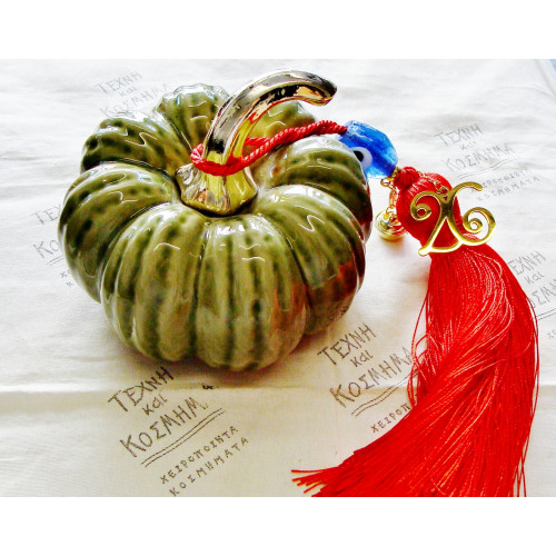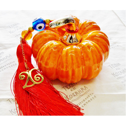 Κεραμική κολοκύθα - γούρι 26, βαμμένη με μοναδικά ανεξίτηλα χρώματα , διακοσμημένη με ατσάλινα και γυάλινα στοιχεία. Η φούντα είναι από μεταξωτό νήμα και συνδέεται με την αίσθηση ολοκλήρωσης και αφθονίας. ΑΡΙΣΤΗ ΕΠΙΛΟΓΗ