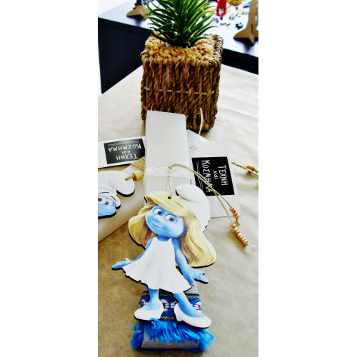 Πασχαλινή αρωματική λαμπάδα 22 εκ. με ξύλινη φιγούρα στρουμφίτα, βαμμένη με ανεξίτηλα χρώματα και διακοσμημένη με βαμβακερή κορδέλα και λινό νήμα .