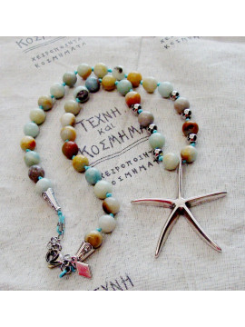 Περιδέραιο με ατσάλινο στοιχείο αστερίας, δεμένο με χάντρες από νεφρίτη ή αχάτη, επαργυρωμένο σε 1000ο ασήμι ή επιχρυσωμένο στα 24 καράτια κίτρινου χρυσού.