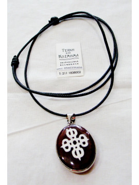 Περιδέραιο με αχάτη χρώματος καφέ και σχέδιο απο ψυχρό σμάλτο , δεμένο με βαμβακερό κορδόνι.