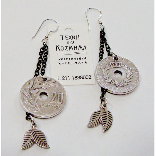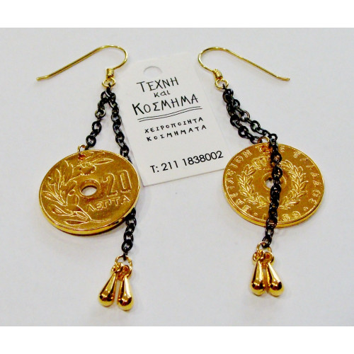 Σκουλαρίκι εικοσάρα (1960) απο μέταλλα κοσμηματοποιίας , επαργυρωμένο ή επιχρυσωμένο , δεμένο με αλυσίδα και γάντζο απο ασήμι 925ο.